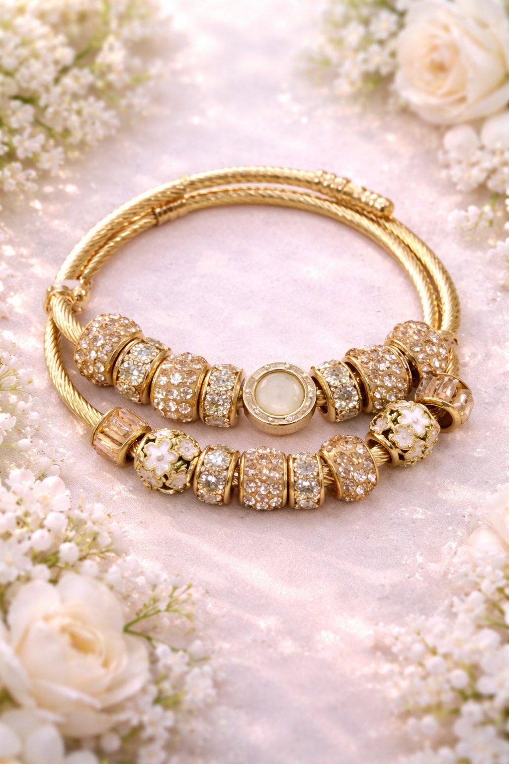 2pc Golden Charm Bracelet Stack, featuring two exquisite gold bangles adorned with sparkling crystal accents. Each bangle is meticulously crafted to capture the light, creating a dazzling effect that will turn heads wherever you go. The elegant design seamlessly blends modern sophistication with timeless charm, making these bracelets perfect for both everyday wear and special occasions. Stack them together for a bold statement or wear them separately for a more understated look—either way, they add a touch of glamour to any outfit. Lightweight and comfortable, these bangles are designed for all-day wear, ensuring you shine bright from morning to night. Treat yourself or gift them to someone special; this bracelet stack is a must-have addition to any jewelry collection!