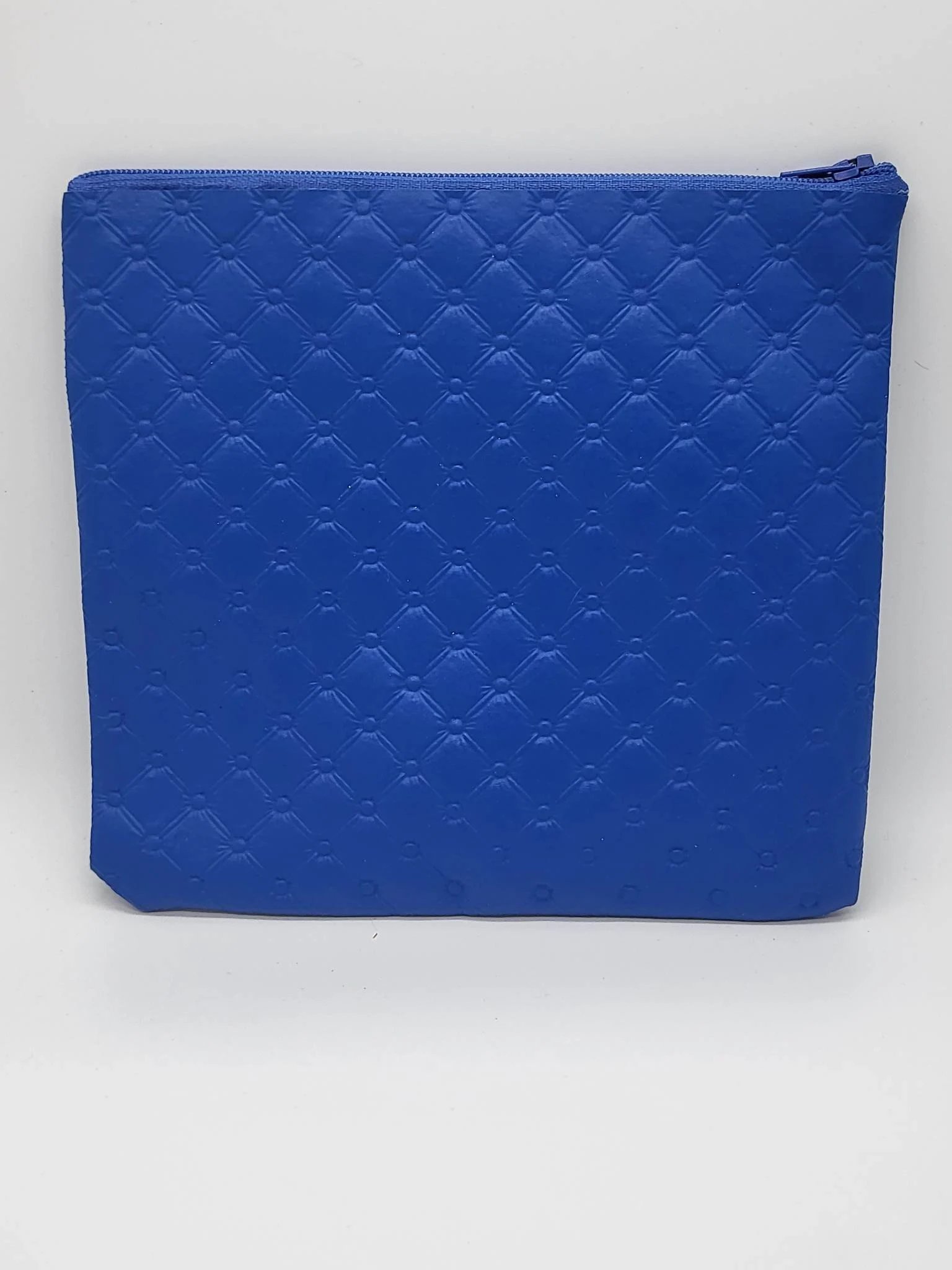 This 8” x 5” handcrafted cosmetic clutch is where culture, craftsmanship, and bold design come together. The exterior is made from rich embroidered cobalt-blue faux leather, giving the bag a soft yet structured feel with a luxe, textured finish. A matching blue zipper ties the entire look together with a clean, modern edge.