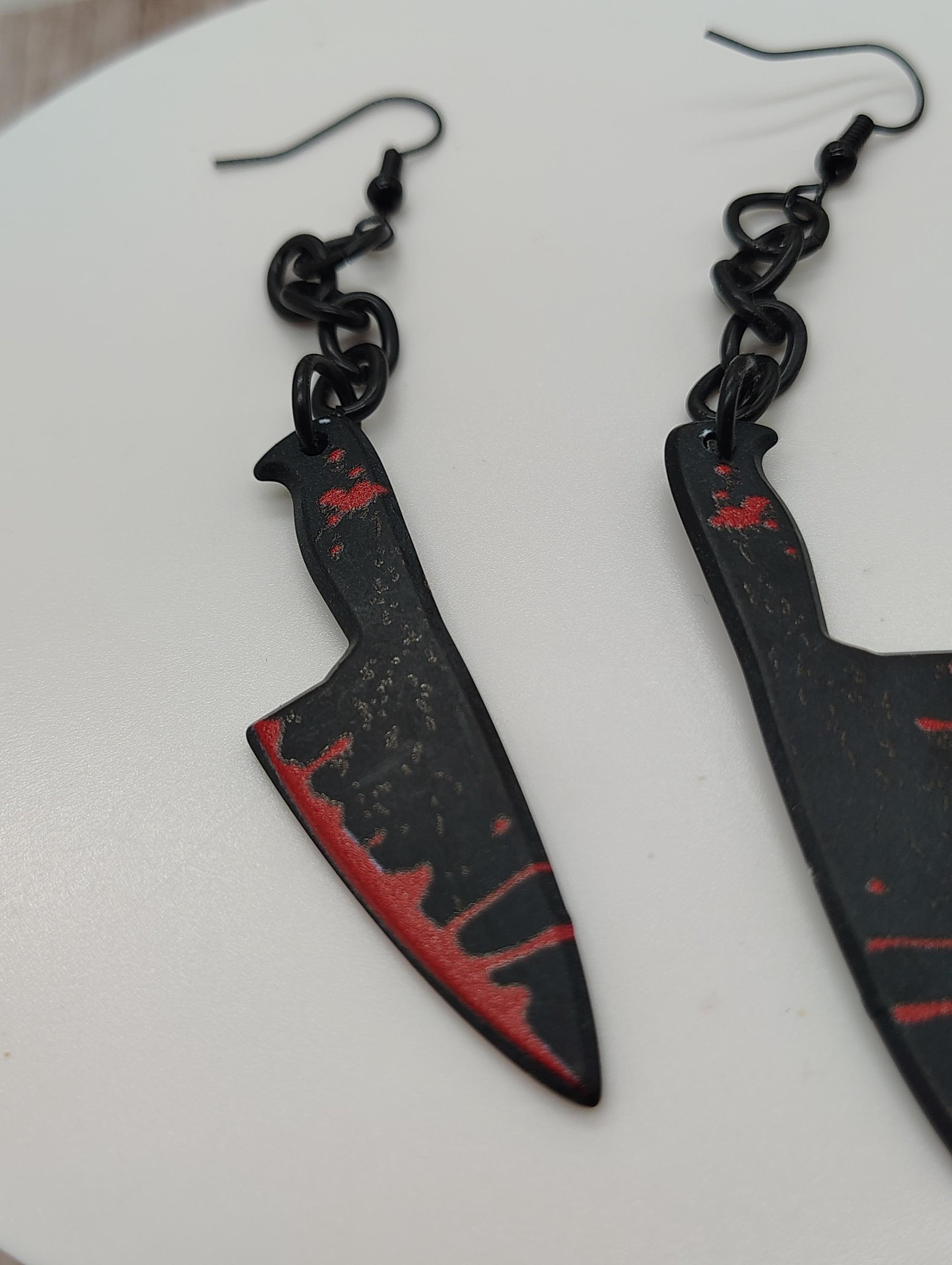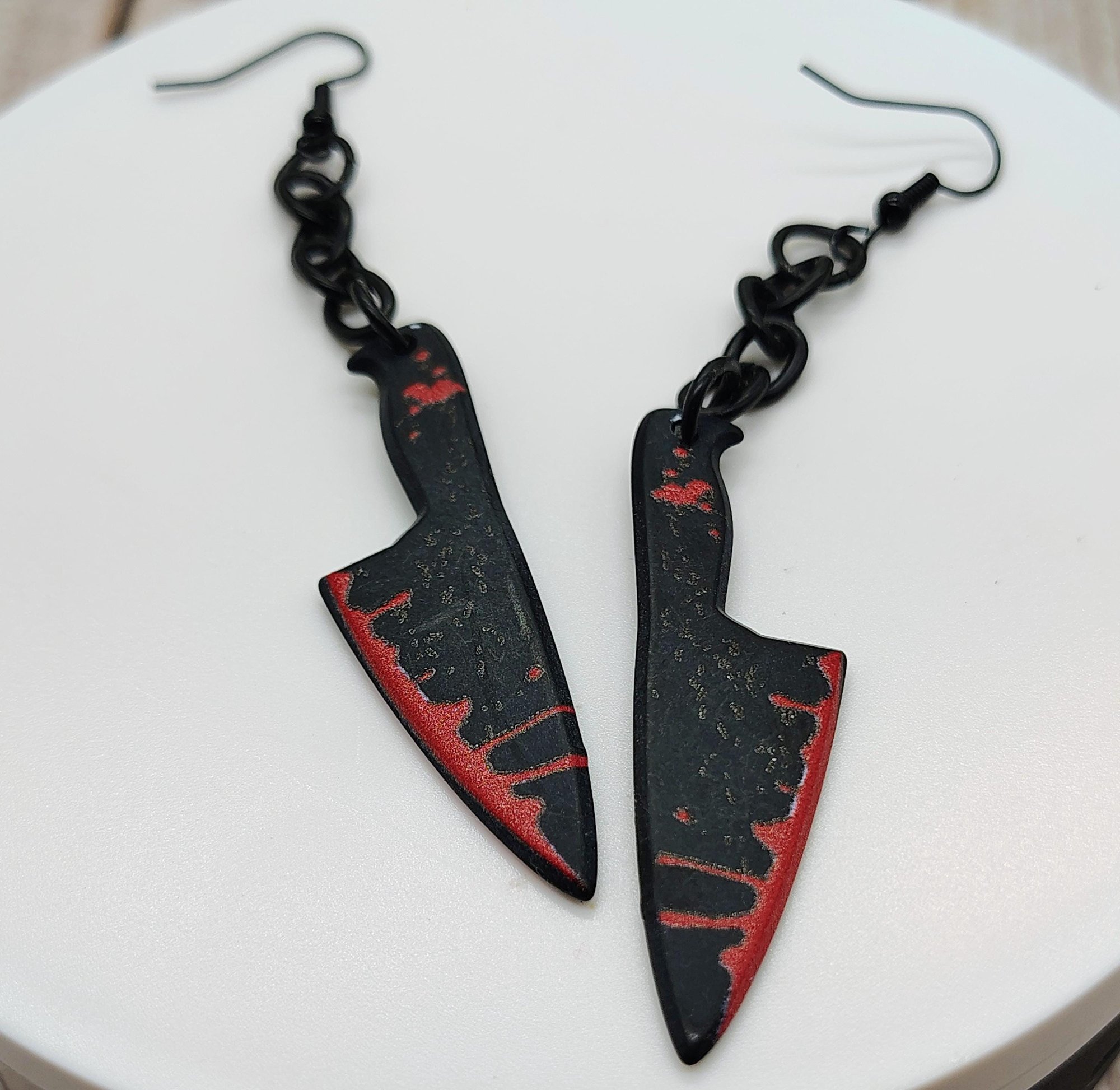 Bloody knives Halloween earrings handcrafted by me. The earrings are approximately 2in with a 5in drop maybe less. These can be shipped right away.