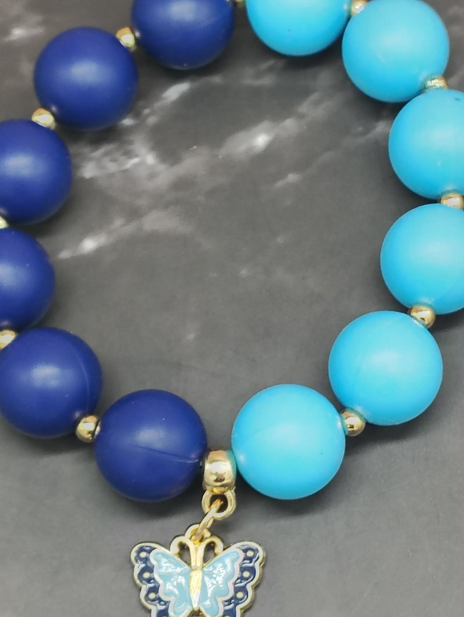 At the center, a delicate butterfly charm shimmers in soft blue and gold, symbolizing transformation, growth, and fresh beginnings. Each bead is smooth, lightweight, and comfortable for all-day wear, while the gold spacers add a touch of elegance and glow.