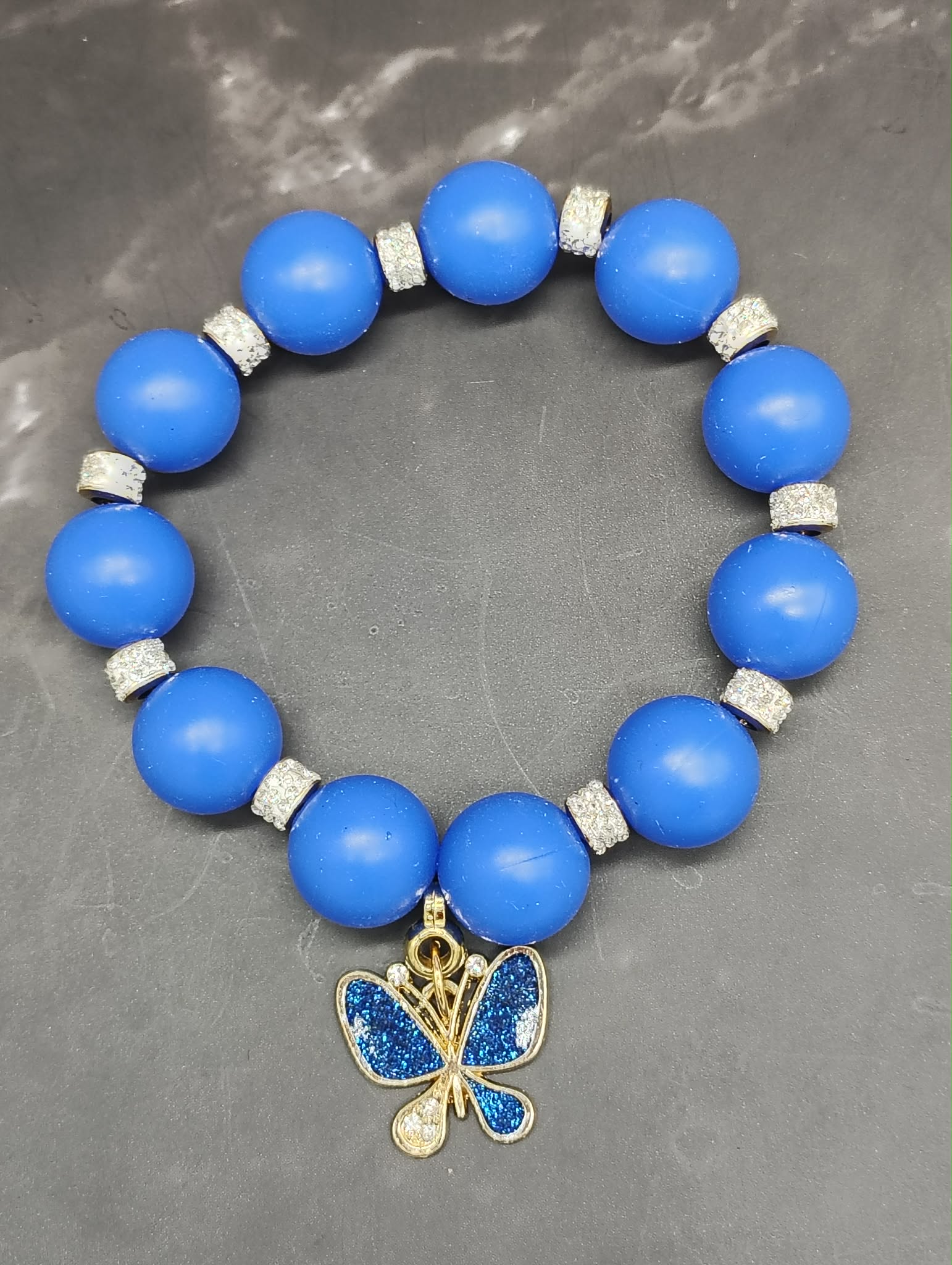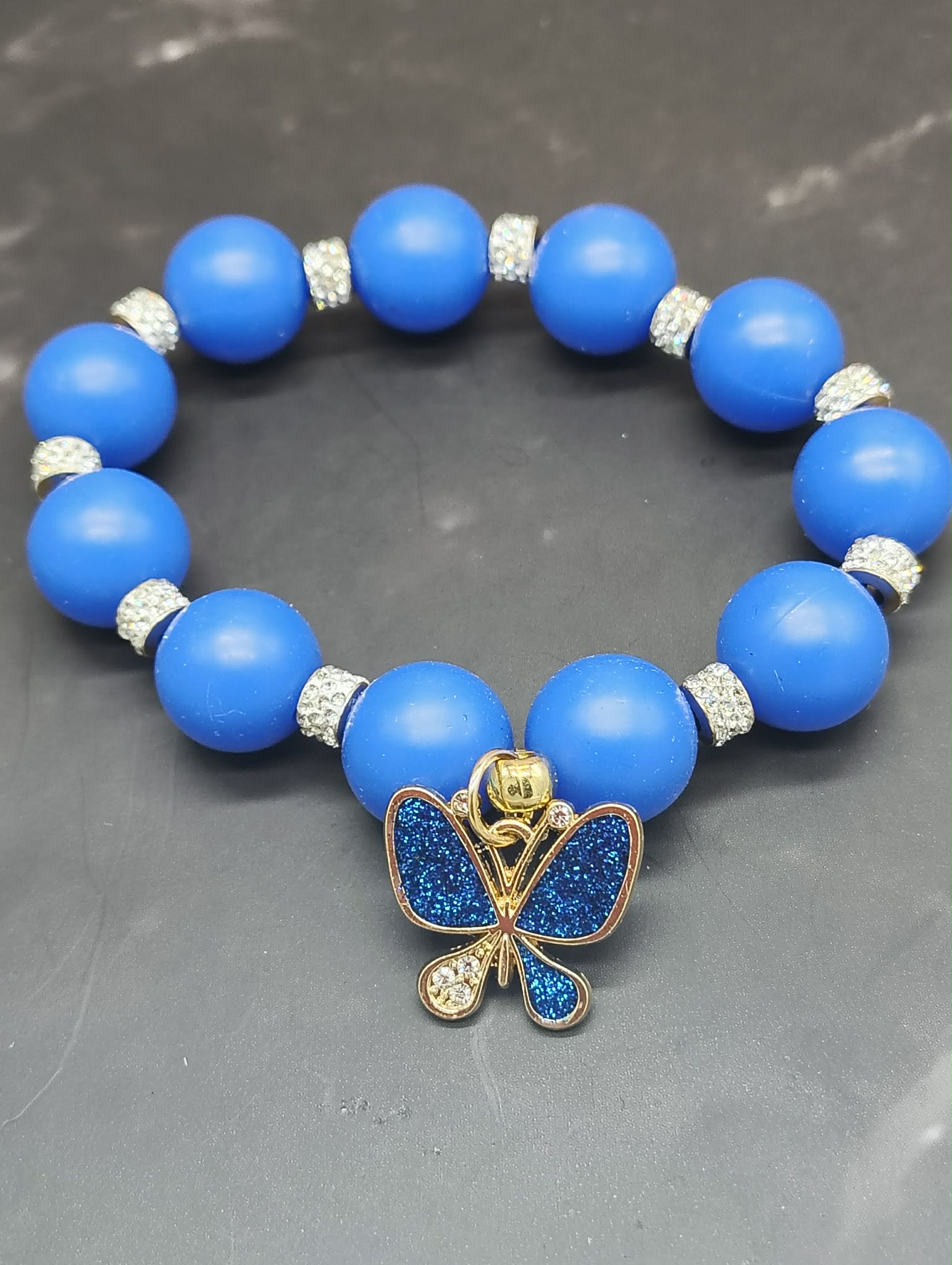 The Blue Flutter Luxe Bracelet is where bold color meets soft elegance. Handcrafted with smooth, vibrant blue silicone beads and crystal-sparkle spacers, this bracelet brings a perfect balance of playful and polished. At the center hangs a dazzling blue butterfly charm, symbolizing beauty, transformation, and confidence — just like the woman who wears it.