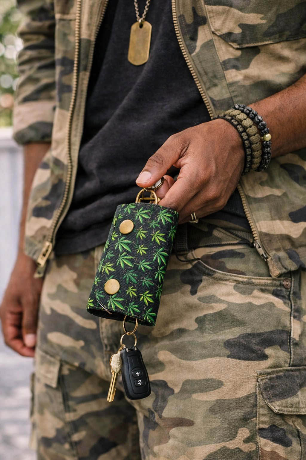 The High Vibes Key Pouch is handcrafted by Arm Kandii using premium faux leather featuring an all-over green cannabis leaf print. Built with secure dual snaps and a rotating interior key clip, this pouch keeps your keys organized, protected, and always ready to grab.