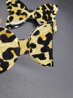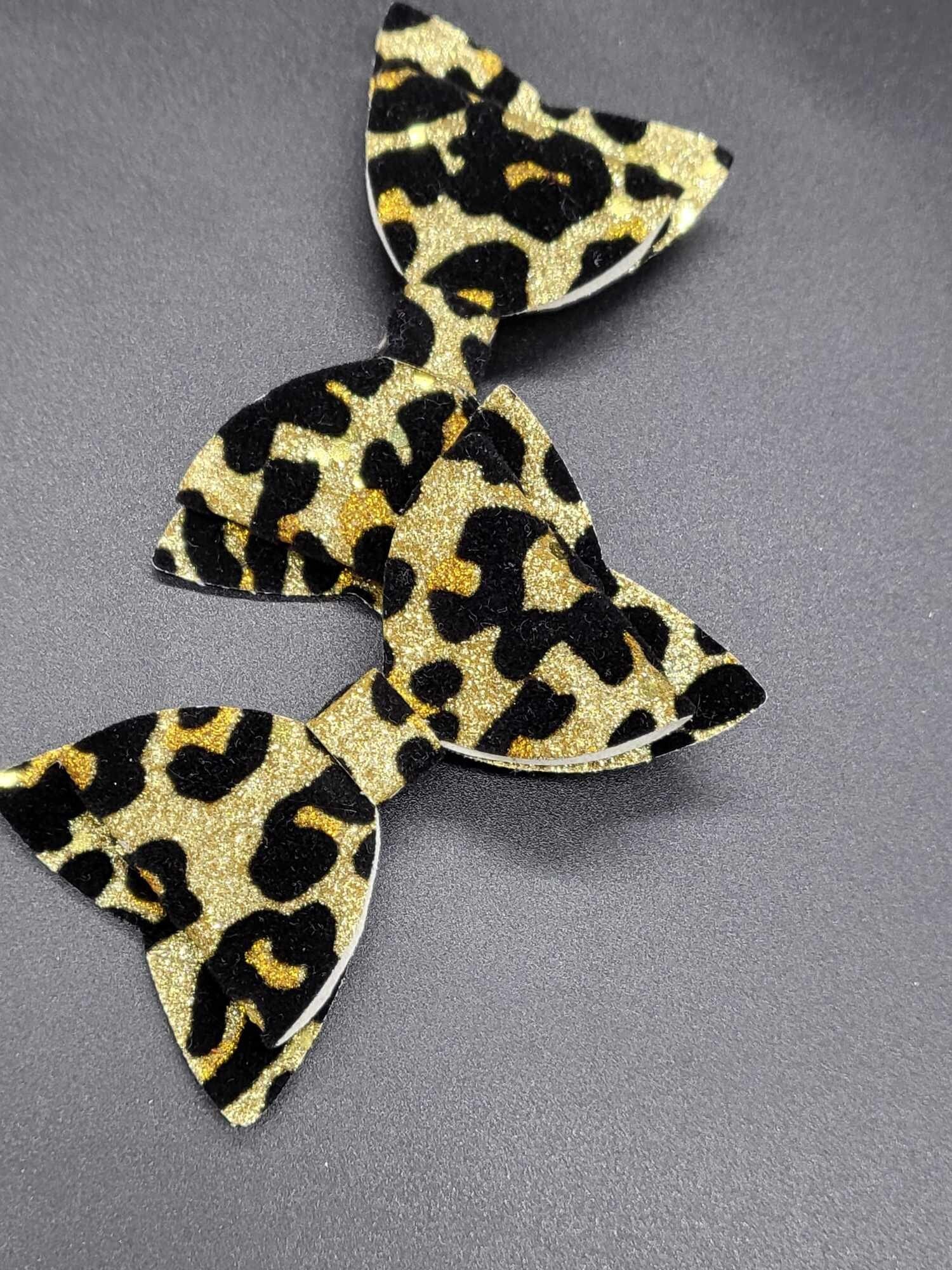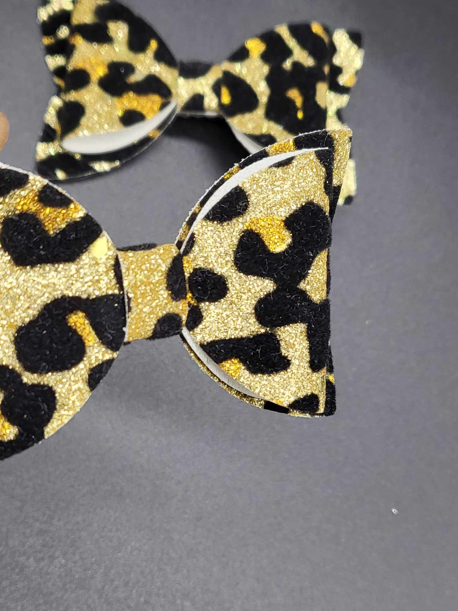 Leopard suede faux leather glitter hair bows represent a unique blend of style, texture, and sparkle that can add a touch of glamour to any outfit. These hair accessories combine the luxurious look of leopard print and the rich texture of suede with the eye-catching shine of glitter, all handcrafted from faux leather for an ethical choice. The faux leather material not only replicates the look and feel of real leather but also offers durability and ease of maintenance, making these hair bows a practical and stylish accessory choice.