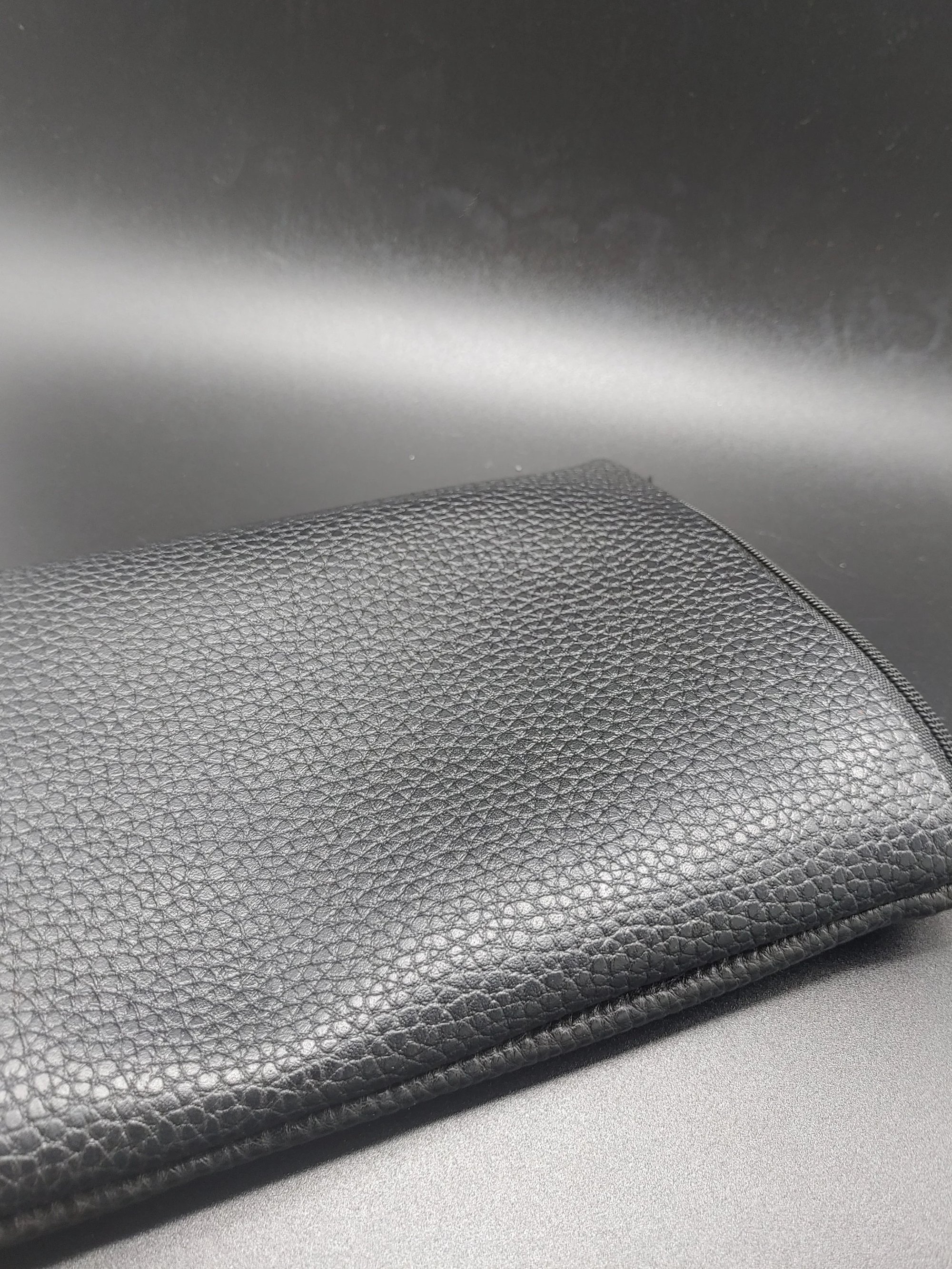 Designed for both beauty and function, this slim yet spacious silhouette is perfect for makeup, touch-up essentials, or everyday must-haves. The smooth black zipper keeps everything secure while maintaining a clean, luxe finish.