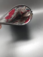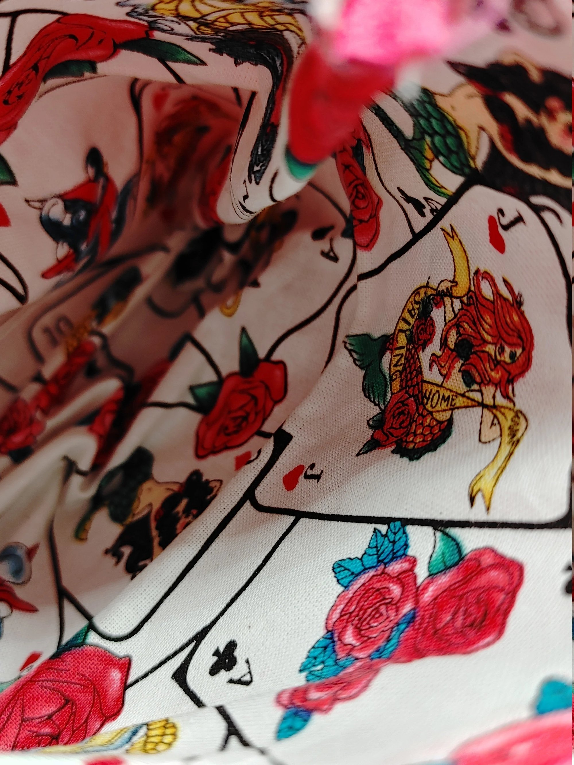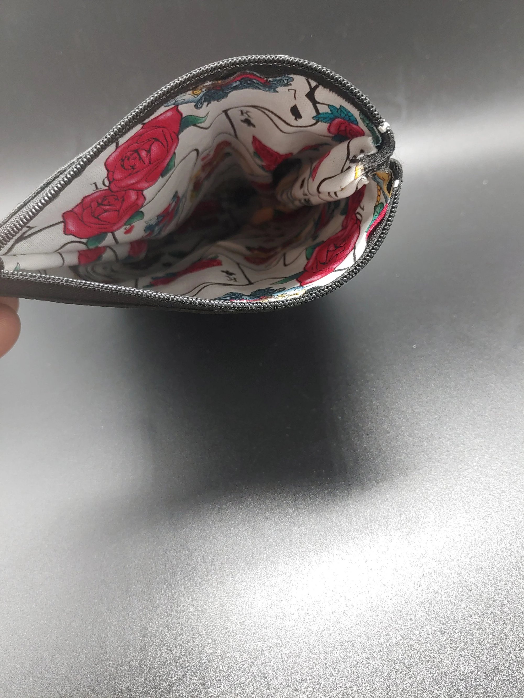 Handcrafted and sewn by Arm Kandii, this exclusive 8" x 4" zip pouch features a rich black faux leather exterior paired with a striking card-print lining that adds an unexpected pop of personality every time you open it.