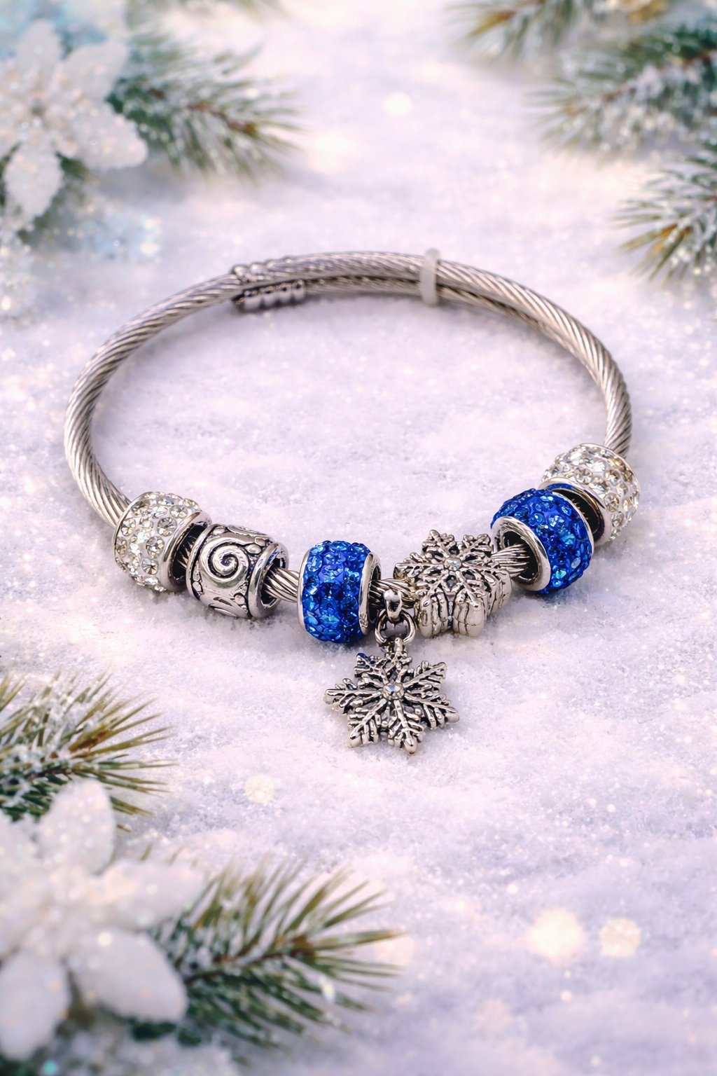 Embrace the enchanting allure of winter with the Snowflake Serenade Bracelet, a stunning piece that beautifully marries elegance and charm. Crafted from high-quality silver, this bracelet features a delicate chain adorned with exquisite blue charms that evoke the serene beauty of snowflakes glistening in the winter sun. Each charm is thoughtfully designed to capture the essence of a winter wonderland, reflecting light and adding a touch of sparkle to your wrist. The harmonious blend of silver and blue not only makes this bracelet a versatile accessory for any outfit but also a perfect gift for those who appreciate the magic of the season. Whether you're dressing up for a festive occasion or adding a touch of whimsy to your everyday look, the Snowflake Serenade Bracelet is sure to become a cherished addition to your jewelry collection. Indulge in the beauty of winter and let your style sing with this captivating piece!